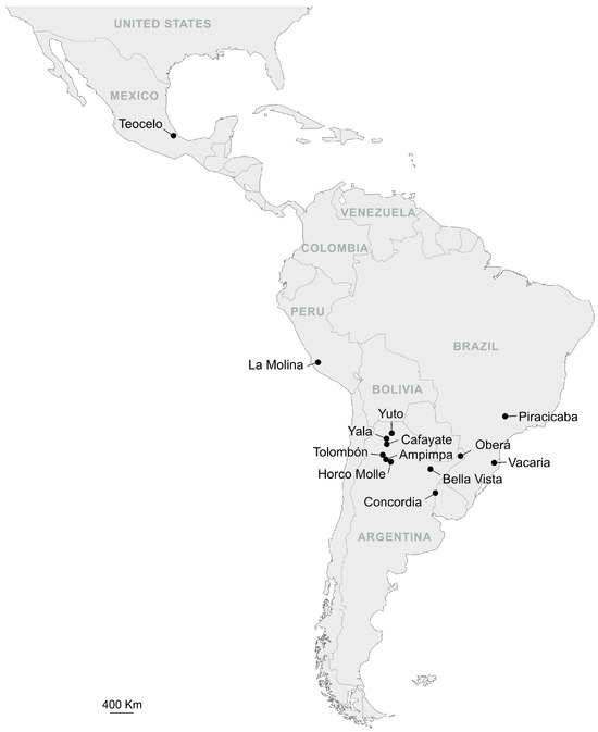 The samples used in this study included five laboratory strains and twelve wild-collected samples. The laboratory strains, indicated by their capitalised names, were TEOCELO (derived from Teocelo, Veracruz State, Mexico), a representative of the Mexican morphotype; LA MOLINA (derived from La Molina, Lima Province, Perú), a representative of Peruvian morphotype 1; VACARIA (derived from Vacaria, Rio Grande do Sul State, Brazil) and HORCO MOLLE (derived from Horco Molle, San Miguel de Tucumán, Tucumán Province, Argentina), representatives of Brazilian morphotype 1; and PIRACICABA (derived from Piracicaba, Sao Paulo State, Brazil), considered to be a representative of Brazilian morphotype 1.