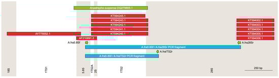 Scheme of the characterisation of the ribosomal DNA region in Anastrepha fraterculus using sequences of A. fraterculus (red) and A. suspensa (green) available in GenBank. The 18S, ITS1, 5.8S, ITS2A, 2S, ITS2, and 28S regions and the positions of the primers and the amplification products (blue) are shown.