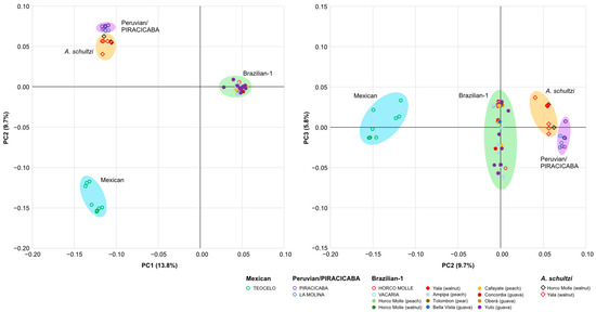 The principal component analysis (PCA) and phylogenetic analyses further supported the genetic differentiation among the morphotypes. The PCA clearly separated the Brazilian-1 morphotype from the Mexican and Peruvian/PIRACICABA morphotypes, while the Peruvian/PIRACICABA and A. schultzi samples were closely associated but distinct. Whether the genetic affinity of A. schultzi with the A. fraterculus Peruvian morphotype suggests a common ancestral origin is an open question. It is noteworthy, however, that A. schultzi was detected for the first time in Peru [43].