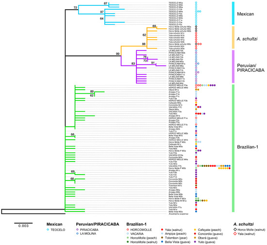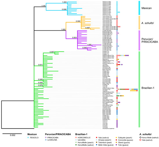 In both trees with an A. suspensa outgroup, the Brazilian-1 haplotypes from the Argentine HORCO MOLLE strain from the wild Horco-Molle individuals from the walnut and peach hosts, from Yala, Ampipa, Bellavista, Cafayate, Concordia, Oberá, Yuto, and Tolombón, and the haplotypes from the Brazilian VACARIA strain do not form a cluster. The first cluster comprises the PIRACICABA strain haplotypes and the LA MOLINA sequences (Peruvian morphotype). The second cluster comprises the haplotype sequences from A. schultzi. Finally, the third cluster contains the haplotypes from the TEOCELO strain (Mexican morphotype).
