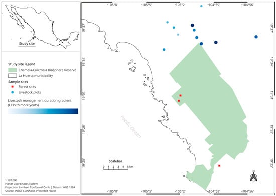 Location of the study plots in the buffer zone of the Chamela-Cuixmala Biosphere Reserve. Color gradation and increasing size of the circles represent the increasing duration of cattle ranching in each pasture.