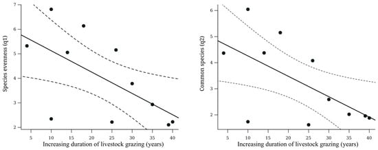 Relationship of species evenness (left figure) and common species (right figure) with the duration of cattle ranching. The solid line represents the trend of the data and the dashed lines represent the 95% confidence interval.