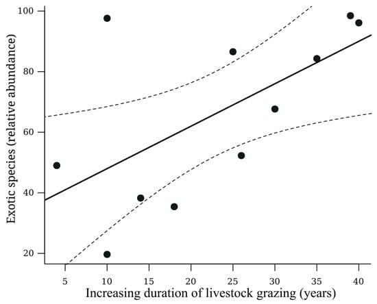Relationship between the relative abundance of exotic species and the duration of cattle ranching. Fit of the linear regression: R2 = 0.38, p = 0.04. The solid line represents the trend of the data and the dashed lines represent the 95% confidence interval.