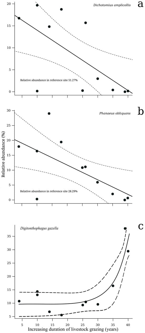 Relationship of the relative abundance of (a) Dichotomius amplicollis (native species), (b) Phanaeus obliquans (native species), and (c) Digitonthopagus gazella (exotic species) with the duration of cattle ranching. The solid line represents the trend of the data and the dashed lines represent the 95% confidence interval.