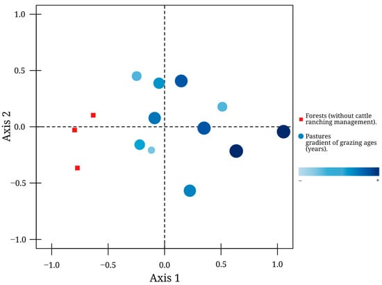 Grouping of plots according to their species composition. The gradient of color and the size of the circles represent the increasing duration of cattle ranching in each site.
