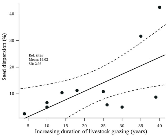 Relationship of the percentage of seed dispersal with the duration of cattle ranching. Average and standard deviation of the percentage of seed dispersal in forests as compared to reference values are shown. The solid line represents the trend of the data and the dashed lines represent the 95% confidence interval.