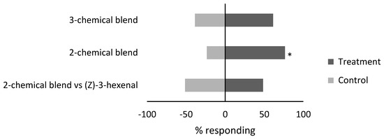 Response (%) of female B. tabaci to two and three chemical blends (treatment) compared to purified air (control) and a 2-chemical blend compared to (Z)-3-hexenal (control) in a Y-tube olfactometer. Blends tested included a two-component blend of (Z)-3-hexenyl acetate (18 µg dose) and (Z)-3-hexen-1-ol (0.17 µg dose), and a three-component blend of (Z)-3-hexenyl acetate (18 µg dose), (Z)-3-hexen-1-ol (0.17 µg dose), and (Z)-3-hexenal (17 µg dose). * Significant difference from the control (p < 0.05, test).
