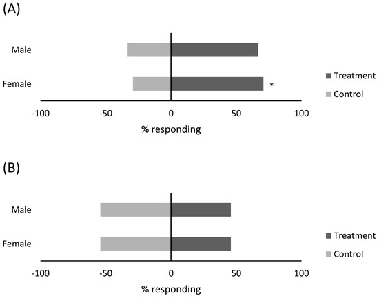 Response (%) of male and female (A) Macrolophus praeclarus and (B) Delphastus catalinae to a two-component blend consisting of (Z)-3-hexenyl acetate (18 µg dose) and (Z)-3-hexen-1-ol (0.17 µg dose) compared to purified air (control) in a y-tube olfactometer. * Significant difference from the control (p < 0.05, test).