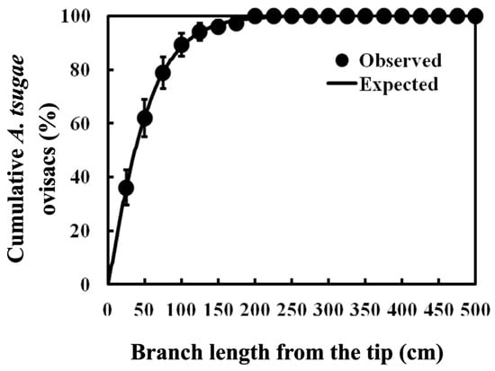 Cumulative ovisac counts (mean ± SE) relative to sample location on the branch 3 m above the ground only when the ovisacs of A. tsugae are present. Note that the non-linear regression was modeled with the Weibull function (see text for details).