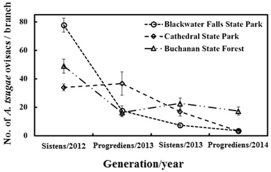 The population of A. tsugae ovisacs decreased throughout this study (Figure 4). When the data from all three sites were pooled, the population density of A. tsugae ovisacs decreased from the first sampling (53.6 ± 2.61 per branch) to the last (8.0 ± 1.04 per branch).