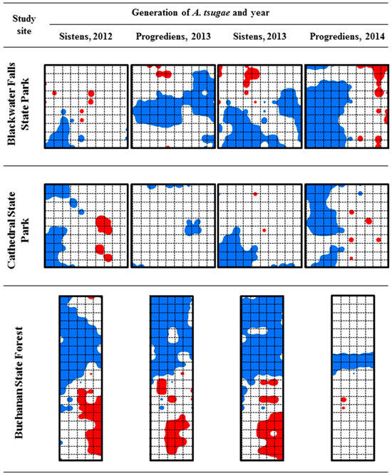 The spatial associations between the generations of A. tsugae ovisacs showed 33% of significant (p < 0.025) positive spatial association and 67% of no spatial association (Table 6). Significant and positive spatial association was found between the sistens generation of 2012 and the progrediens generation of 2013, between the progrediens and sistens generations of 2013 in Buchanan State Forest, and between the progrediens and sistens generations of 2013 in Blackwater Falls State Park (Table 6). However, the A. tsugae distributions in Cathedral State Park did not show significant spatial associations between generations.