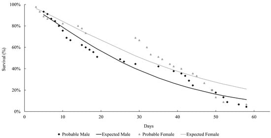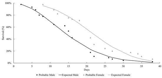 The life expectancy of males and females observed at both temperatures followed a Weibull distribution, as shown in Figure 1 and Figure 2. At both temperatures, the females lived longer than the males (27 °C: females = 37.9 days; males = 29 days; 29 °C: females = 21.8 days; males = 15.2 days). Mackerras [33] studied different species of flies and found that the females lived longer than the males. Ferraz [34] reported the same observation for the flesh flies Peckia (Peckia) chrysostoma (Wiedemann, 1830) and Peckia (Peckia) ingens (=Adiscochaeta ingens) (Walker, 1849). On the other hand, Oliveira et al. [35] reported a longer lifetime for the males of Peckia (Pattonella) intermutans (=Pattonella intermutans) (Walker, 1861). Furthermore, the females of P. (S.) trivittata lived longer than the males at 16 ± 1 °C and 50–60% RH; however, the males lived longer at 27 ± 1 °C and 70–80% RH [29].