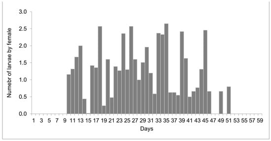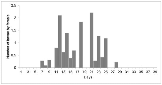 The females reared at 27 °C laid 1498 larvae and 303 eggs from day 10 to 51 of life, but only 11 eggs were viable. Larviposition reached the maximum on days 18, 26, and 35, with approximately 2.5 larvae per female. The larviposition rhythm at 27 °C is shown in Figure 3. At 29 °C, the females laid 396 larvae and 12 eggs from day 7 to day 28 of observation. The peak of larviposition occurred on days 12, 18, and 21 (Figure 4), with the same ratio of approximately 2.5 larvae per female. The females laid three times more larvae at 27 °C than those at 29 °C, and the number of days on which they laid larvae was higher. At 27 °C, larviposition occurred for 38 days, whereas, at 29 °C, the females larviposited for only 21 days.