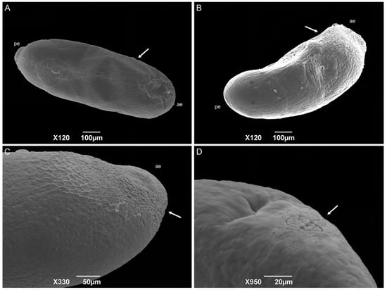 Scanning electron microscopy of Helicobia aurescens (Diptera: Sarcophagidae) eggs. (A,B) Egg showing the anterior end (ae), posterior end (pe), and the hexagonal pattern of the chorionic cells (arrow). (C) Anterior end (ae) with a more detailed observation of the hexagonal pattern (arrow). (D) Aeropyles (arrow) located at the posterior regions. Pictures: Electron Microscopy Platform Rudolf Barth—IOC/FIOCRUZ.