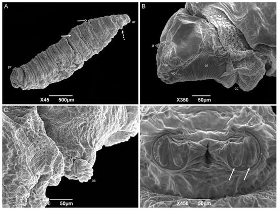 Scanning electron microscopy of Helicobia aurescens (Diptera: Sarcophagidae) first-instar larvae. (A) Larval body with the anterior region (ar), posterior region (pr), and highlighting of the intersegmental spines (arrow); (B) Ventral–lateral view of the pseudocephalon with an antenna (a), maxillary palps (mp), the ventral organ (vo), the oral ridges (or), the cephalic collar (cc), and the mandible (m). (C) Intersegmental spines composition and characteristics. (D) Posterior spiracle with two openings (arrows) located inside a spiracular cavity. Pictures: Electron Microscopy Platform Rudolf Barth—IOC/FIOCRUZ.