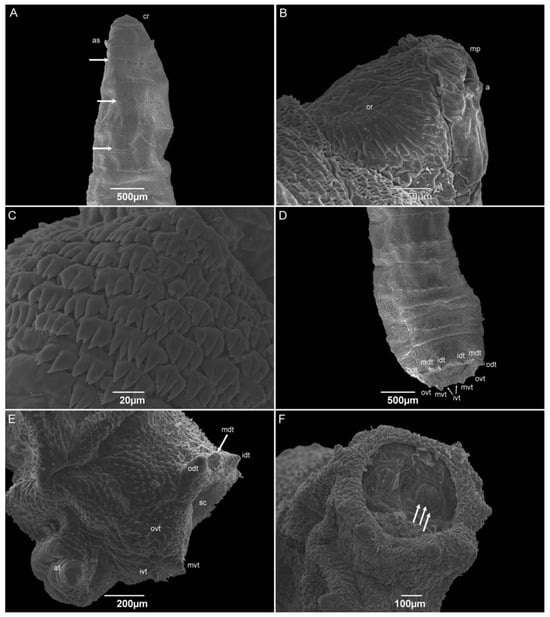 The third-instar larvae have a vermiform format with a pointed anterior and truncated posterior region. The median length is 6.53 ± 0.54 mm. The pseudocephalon has all the completely developed structures, with a domed shape antenna, maxillary palps with semi-disc structures surrounding the papillae, oral ridges composed of several grooves, and a pair of ventral organs between the maxillary palps and the oral ridges (Figure 8A,B). The cephalic collar or spines between the pseudocephalon and the first thoracic segment have at least eight complete rows (Figure 8C). The spines are located individually or in groups of up to four, and with one or two tips. A pair of anterior spiracles with eight ramifications in a regular row is located dorsolaterally in the posterior region of TI. The intersegmental spines (TIII–AI) are more concentrated on the dorsal surface than they are on the lateral and ventral surfaces; the rows are seemingly interrupted on the lateral sides at the level of the anterior spiracles. The spines have a shark-tooth-like shape, are organized singly or in pairs, and have a single or double tip. The papillae are organized in a row in the middle of the segments AI–AVII. The integument of the abdominal segments (AI–AVIII) is covered with wart-like structures. The dorsal and lateral posterior spines were only present on the AVI and AVII segments and face anteriorly. No anterior dorsal spines are present on the AVIII segment. The anal division or AVIII has a deep cavity where the posterior spiracles are located. Spiracular plates have three linear slits. The presence of a spiracular scar could not be seen. The spiracular cavity is surrounded by six pairs of tubercles and filiform spines, which face out of the cavity (Figure 8D,E). The ventral surface of the AVIII segment is covered with small spines compared to the intersegmental ones. The perianal pad that has an anal opening, and two anal tubercles are covered with spines, and the anal papillae are located at the apex of the tubercles (Figure 8F).