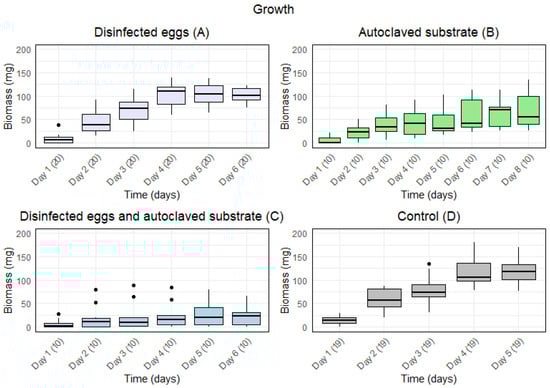 Disinfected eggs and/or autoclaved substrate resulted in a slower growth (Figure 1). Furthermore, for A (disinfected eggs) and D (control), the median biomass increased from day to day for the first five days. For B (autoclaved substrate), the median biomass increased during the first four days and from day five to day seven. For C (disinfected eggs and autoclaved substrate), the median biomass increased during the first two days and from day four to day six.