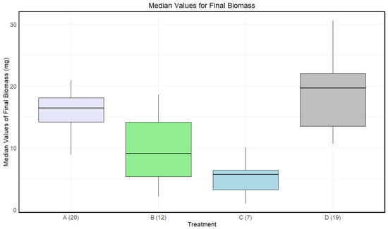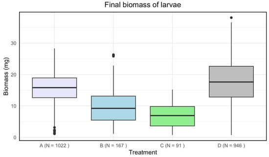 Boxplots with the medians (25–75% quantiles) of the final biomass of larvae for treatment A (disinfected eggs), B (autoclaved substrate), C (disinfected eggs and autoclaved substrate), and D (control). The x-axis shows treatments and sample size (N), and the y-axis shows the biomass (mg).