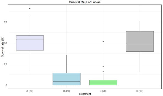 Boxplots with the medians (25–75% quantiles) of the survival rate of larvae for treatment A (disinfected eggs), B (autoclaved substrate), C (disinfected eggs and autoclaved substrate), and D (control). The x-axis shows treatments and sample size in parentheses, and the y-axis shows the survival rate (%).