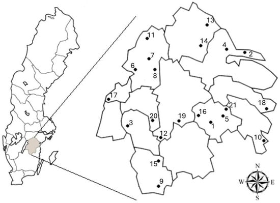 Location of the 21 study sites where smoke attraction trapping was used to catch insects in forests in Östergötland county, Sweden. Borders show the 13 municipalities within the county; n.b. that fire statistics from 11 municipalities in adjoining counties were included.