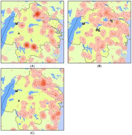 The forest fire history in Östergötland county divided into three time periods: 1–4 yrs prior to sampling (2007–2010) (A); 5–8 yrs (2003–2006) (B); and 9–12 yrs (1999–2002) (C). Each dot represents a fire. Darker areas show higher fire frequency, yellow indicate low fire frequency. Dark polygons indicate cities (only shown against the yellow background).