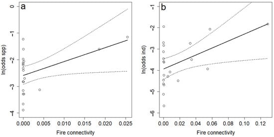 The relationship between spatiotemporal connectivity to fires and the ln(odds) of finding a pyrophilic beetle species (a) and individual (b) among the beetles in the smoke attraction traps. Circles represent trap sites. Regression line (solid) with confidence band (dotes lines) are indicated.
