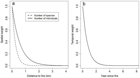 Weight of the contribution of fire j to the spatiotemporal fire connectivity of smoke attraction trap i (see Equation (1)). The spatial scaling parameter (αs) was 1.7 for individuals and 4.0 for species (a), while the temporal scaling parameter (αt) was 1.4 for both response variables (b).