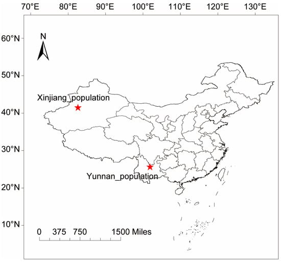 To examine the effect of Wolbachia on the thermal preference of L. huidobrensis, we selected two representative populations of L. huidobrensis: Yunnan, where it was first reported in China, and Xinjiang, where it has recently spread after invasion [,,]. These two wild populations, naturally infected with Wolbachia, were collected in March 2023 from cowpea plants in Yunnan (25.72° N, 101.87° E) and in April 2023 from tomatoes in Xinjiang (41.55° N, 82.62° E) (Figure 1). Upon transition to the laboratory, the Wolbachia wLhui-infected lines from each population were established. The wLhui-uninfected lines were derived through three generations of tetracycline treatment (1 mg/mL), followed by six generations of recovery without tetracycline to mitigate potential side effects. The Wolbachia infection status of each strain was verified via PCR before the experiment, as detailed previously []. All leaf-miner lines were maintained on bean seedlings under controlled laboratory conditions: 25 ± 1 °C temperature, 60% relative humidity, and a 16 h light/8 h dark cycle.