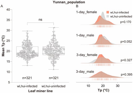 When comparing the average Tp of wLhui-infected and uninfected leaf miners of the same age and sex, no significant differences were observed between the two lines (p > 0.05 for all cases; Figure 2B). Both lines of leaf miners exhibited a broad range of Tp values, spanning from 11.2 °C to 31.4 °C, with considerable overlap in the Tp distributions of the two leaf-miner lines (Figure 2B).