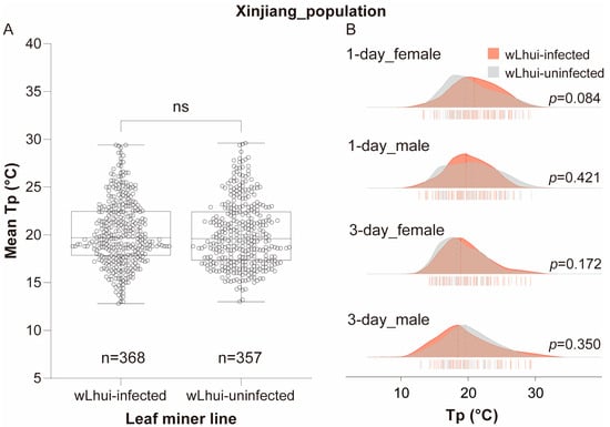 In the Xinjiang population, the average Tp values of wLhui-infected and uninfected leaf miners were nearly identical (wLhui-infected = 19.70 °C, wLhui-uninfected = 19.60 °C), with no significant statistical difference (Mann–Whitney U test, p = 0.469; Figure 3A). Similar results were observed when comparing infected and uninfected leaf miners of the same age and sex (p > 0.05 for all cases; Figure 3B). The Tp of the two leaf-miner lines in the Xinjiang population ranged from 12.8 °C to 29.6 °C, with some overlap in the Tp distributions (Figure 3B).