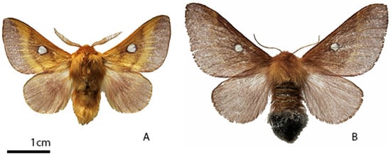 Eriogaster catax L. adults: (A) male; (B) female. Specimens from the Zoological Museum of Babeș-Bolyai University.