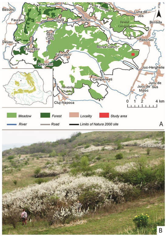 The present study took place on the surface of the Natura 2000 Site, Eastern Hills of Cluj, ROSCI0295 (Figure 3). The location was chosen based on previous monitoring studies focused on lepidopterans, which revealed a large number of E. catax nests. According to [], the Dealurile Clujului Est Site comprises 5531 hectares of meadows and 405 hectares covered with arboreal vegetation. Furthermore, on most meadows, P. spinosa and C. monogyna bushes can be found in various proportions [].