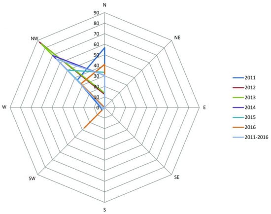 A significant majority of nests (65.14%; n = 386) were positioned on the north-western exposition (Figure 5) (p < 0.0001; χ2 = 884.45; df = 3), followed by the northern one (Table 3).