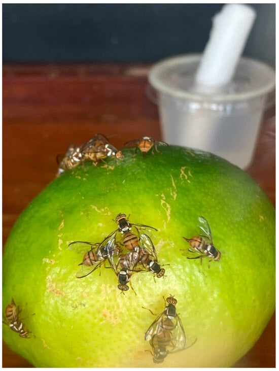 - Follett, P.A.; Asmus, G.; Hamilton, L.J. Poor host status of Australian finger lime, Citrus australasica, to Ceratitis capitata, Zeugodacus cucurbitae, and Bactrocera dorsalis (Diptera: Tephritidae) in Hawai’i. Insects 2022, 13, 177. [Google Scholar] [CrossRef] [PubMed]