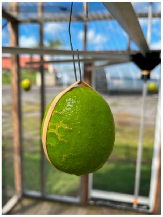 - McQuate, G.T.; Follett, P.A.; Liquido, N.; Sylva, C.; Brown, S. Assessment of Navel oranges, Clementine tangerines and Rutaceous fruits as hosts of Bactrocera cucurbitae and Bactrocera latifrons (Diptera: Tephritidae). Int. J. Insect Sci. 2015, 7, 1–9. [Google Scholar] [CrossRef]