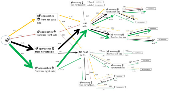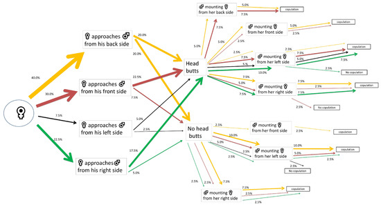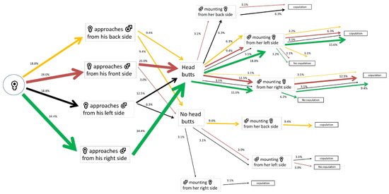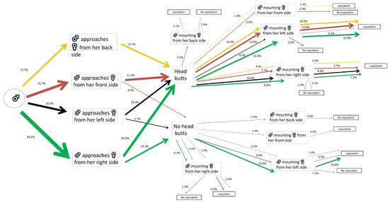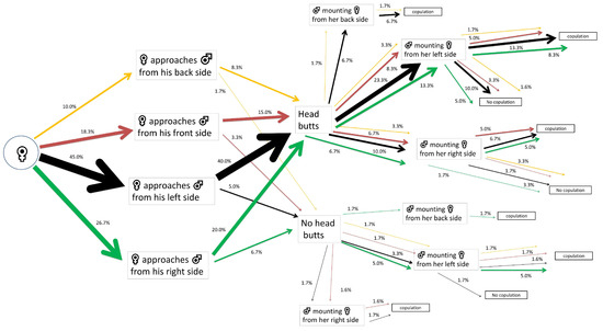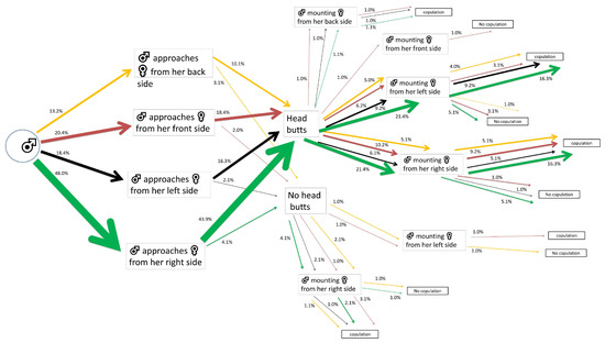 The majority of the control males that first approached their mates showed a right-side tendency (38.6% out of 100%). Most of these performed head butts (24.3% out of 38.6%) and 12.9% out of 24.3% of males mounted the females from the left side of their bodies, achieving successful copulations (Figure 1).