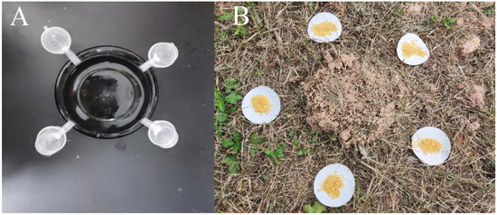 Preference of fire ants for sulfoxaflor, triflumezopyrim, and flupyradifurone baits. The equipment for (A) preference in laboratory; (B) the five filter paper containing baits with different concentration insecticide were placed around the mound.