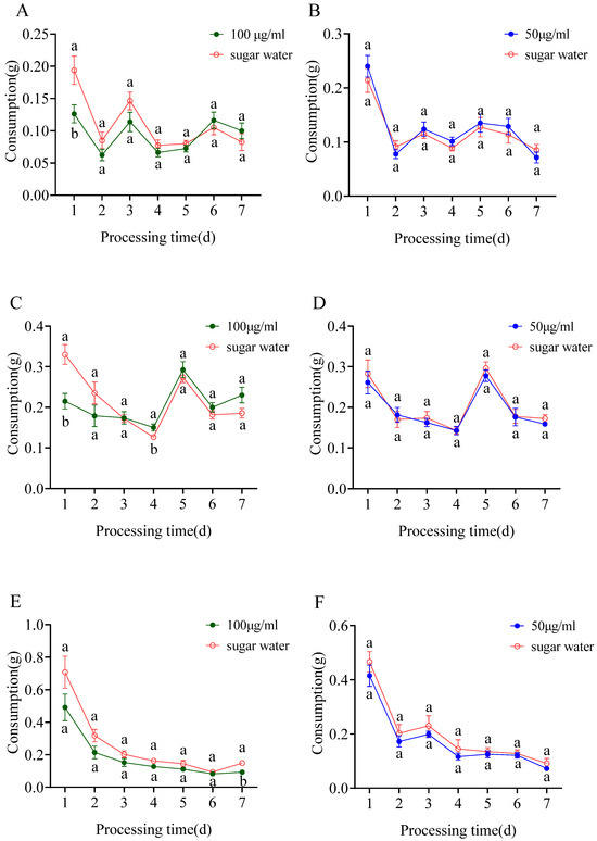 Effects of sulfoxaflor (A,B), flupyradifurone (C,D), and triflumezopyrim (E,F) at different concentrations on the food consumption of the fire ants for 7 days (means ± SE). The same letter at the same time in the figure indicates no significant difference by the independent samples t test (p > 0.05).