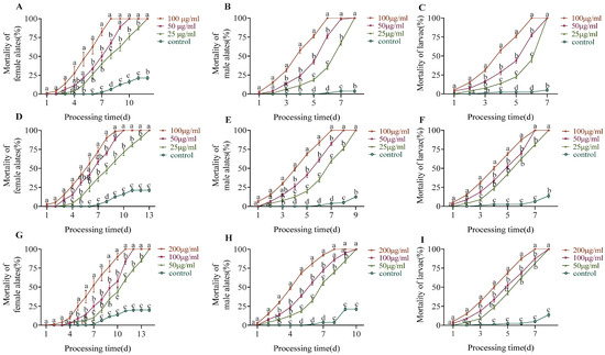 All the female alates that were fed 100 μg/mL sulfoxaflor died before Day 8, whereas all the male alates and larvae died before Day 7 (Figure 3A–C). After 8 days of treatment, the mortality rate of the female alates that were fed 100 μg/mL sulfoxaflor was significantly higher than that with other treatments (χ2 = 27.987, df = 3, p < 0.0001). After 6 days of treatment, the mortality rates of the male alates (χ2 = 30.038, df = 3, p < 0.0001) and larvae (χ2 = 29.885, df = 3, p < 0.0001) that were fed 100 μg sulfoxaflor were significantly higher than the other sulfoxaflor.