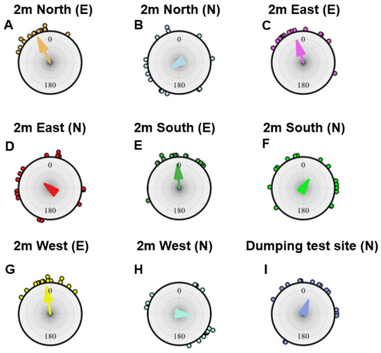 Headings on displacement tests. Circular histograms of initial headings of foragers during the displacement tests at 2 m north in experienced (A) and naive (B) ants, at 2 m east in experienced (C) and naive (D) ants, at 2 m south in experienced (E) and naive (F) ants, and at 2 m west in experienced (G) and naive (H) ants, and at the test site nearest to the dumping location of each naive ant (I). In the figure title, E denotes experienced and N denotes naive. In the histograms, the nest direction is set at 0°. The arrows denote the length and direction of the mean vector.