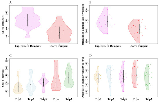 Comparison of speed and orientation angular velocity of experienced and naive dumpers in Experiment 2 and over five consecutive dumping trips in Experiment 3. The violin plots show the mean speed of experienced and naive dumpers across their entire trajectory in Experiment 2 (A) and the mean speed across trials in Experiment 3 (C). The half-violin plots show the distribution of bootstrapped differences in mean orientation angular velocity of experienced and naive dumpers in Experiment 2 (B) and across trials in Experiment 3 (D). The solid dots show the mean, while the vertical bars show the 95% confidence interval of the mean.