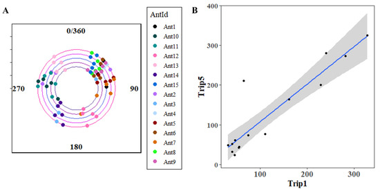 To understand whether experienced and naive dumpers have specific directional preferences, we examined their heading directions from the nest. In Experiment 2, the final headings of both experienced (mean vector direction (µ) = 141.26, length of mean vector (r) = 0.37) and naive dumpers (mean vector direction (µ) = 42.99, length of mean vector (r) = 0.28) were randomly distributed around the nest (Appendix A Figure A1). The Rayleigh test revealed that the ants’ initial and final heading orientations were uniformly distributed in experienced (Z = 2.07, p = 0. 12) and naive dumpers (Z = 1.22 p = 0.3) (Appendix A Figure A1). This suggests that dumpers as a population do not head off in a preferred direction or sector. In heading direction across all dumpers in Experiment 3, the distribution of directions from the nest was random (Appendix A Figure A1). The Rayleigh test revealed that the ants’ final heading orientations were uniformly distributed in all dumping trials (Trip1: Z = 2.78, p = 0. 06; Trip2: Z = 0.36, p = 0. 7; Trip3: Z = 1.23, p = 0. 29; Trip4: Z = 1.05, p = 0. 35; Trip5: Z = 1.77, p = 0. 17). We also compared the empirical distributions across the five trips with Kuiper and Watson–Wheeler tests, and both showed non-significance in direction heading (Kuiper: V = 0.13.4, p = 0.65; Watson–Wheeler test: W = 2.61, p = 0. 26). This means that the five trips were not significantly different in mean or variance. Dumpers as a population did not head off in a preferred direction. To examine sector fidelity in individual ants across trips (Figure 9), we conducted Hotelling’s test, and it showed significant directional preference in individuals (F = 60.46, p = 0.004). Dumpers as a group showed sector fidelity.