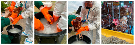 The dipping method: hens were dipped in the solution, covering the entire body for 1 min, then picked up and placed in a cage.