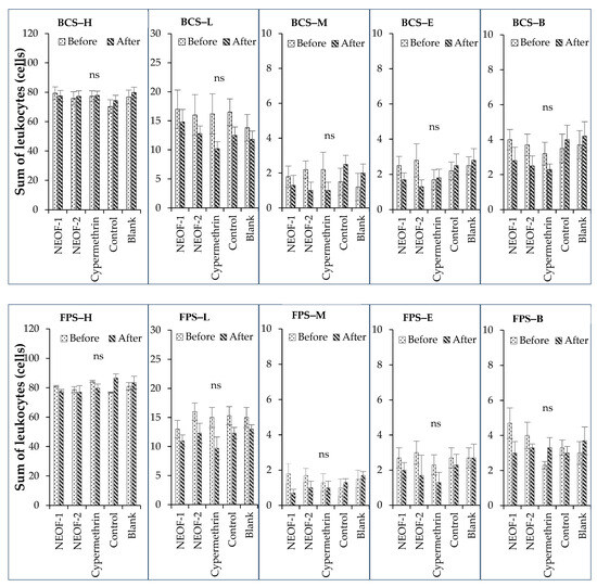 Differential leukocyte counts (means ± SE) in chicken blood after using nanoemulsion-based plant essential oil formulations (NEOFs) to control poultry ectoparasites in egg-laying chicken farm conditions (battery cases and floor pen systems) compared with cypermethrin insecticide application. Control (Tween60/PEG400 = 9:2, 1.625%), cypermethrin insecticide 35%EC (recommended dose; 0.1%), NEOF-1 (NEO-CL:NEO-CN = 1:0), NEOF-2 (NEO-CL:NEO-CN = 1:1), NEO-CL (clove/Tween60/PEG400 = 2:9:2), NEO-CN (cinnamon/Tween60/PEG400 = 2:9:2), NEOF-1 and NEOF-2 at 0.25% of EOs in water, BCS = battery cages system, FPS = floor pen system, H = heterophil, L = lymphocyte, M = monocyte, E = eosinophil, B = basophil, ns indicates non-significant difference at p < 0.05.