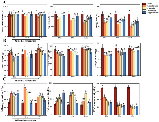 During the larval stage, larvae treated with thiamethoxam at LC30 showed a 25.9% increase in body weight compared to the control group (2.28 ± 0.018 g). In contrast, larvae treated with avermectin, chlorfenapyr, and β-cypermethrin exhibited lower body weights than the control, although their weights increased with higher concentrations. Across all treatments, body weights remained consistently lower than controls during both the pupal and fledging stages. No significant differences in body weight were observed between the chlorfenapyr and β-cypermethrin groups at emergence, which was possibly due to environmental adaptability in the insects (p < 0.05, Figure 1B).