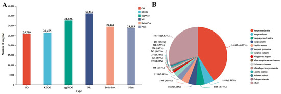 Functional annotation and species distribution of unigenes in Vespa magnifica transcriptome. (A) Annotation result statistics of unigenes of Vespa magnifica transcriptome in different databases. (B) Species distribution of unigenes of Vespa magnifica NR database.
