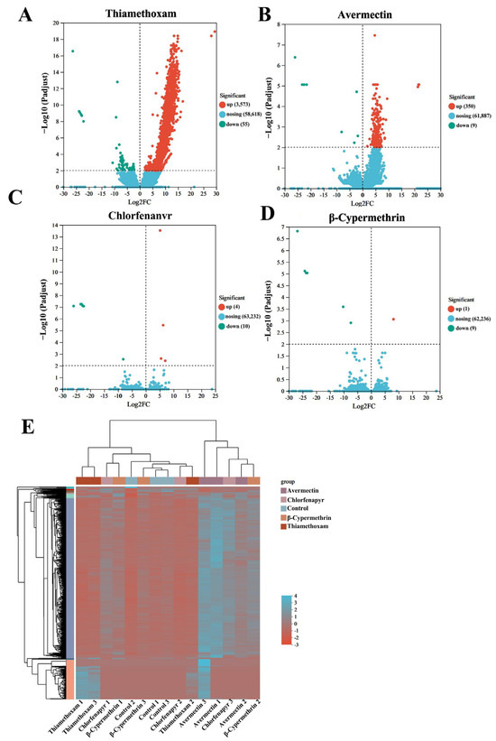 DEGs between the control and four insecticides exposure for 24 h. (A) DEGs induced by thiamethoxam at an LC10 dose. (B) DEGs induced by avermectin at an LC10 dose. (C) DEGs induced by chlorfenapyr at an LC10 dose. (D) DEGs induced by β-cypermethrin at an LC10 dose. (E) Cluster analysis of DEGs of Vespa magnifica.