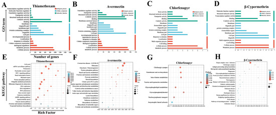 GO and KEGG enrichment analysis of DEGs reveals key pathways and functions affected by insecticide treatments in Vespa magnifica. (A) GO aggregation map of DEGs in thiamethoxam and control. (B) GO aggregation map of DEGs in avermectin and control. (C) GO aggregation map of DEGs in chlorfenapyr and control. (D) GO aggregation map of DEGs in β-cypermethrin and control. (E) Enrichment analysis of KEGG pathway of thiamethoxam and control DEGs. (F) Enrichment analysis of KEGG pathway of avermectin and control DEGs. (G) Enrichment analysis of KEGG pathway of chlorfenapyr and control DEGs. (H) KEGG pathway enrichment analysis of cypermethrin and control DEGs.