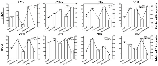 qPCR validation of nine DEGs related to the CYP450 enzyme system confirms consistency with RNA-seq data.