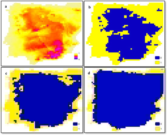 Examples of SDM output (a) and threshold-based classified maps for values 0.6 (b), 0.7 (c), and 0.8 (d).